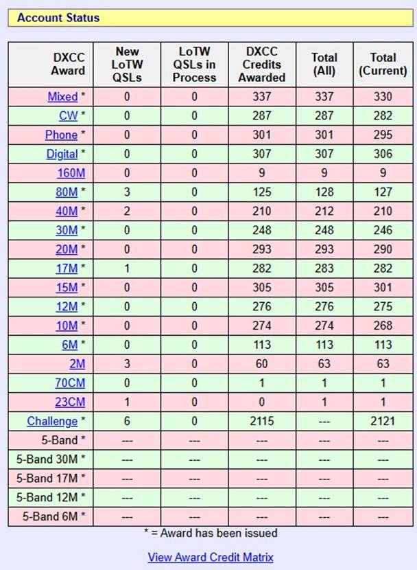 DXCC (Countries Worked) LOTW Status As Of December 17, 2025 * = DXCC Has Been Awarded 9 Bands, 80 though 6 Meters Does not include QSOs confirmed by QSL Cards only that have not yet been submitted to the ARRL. |